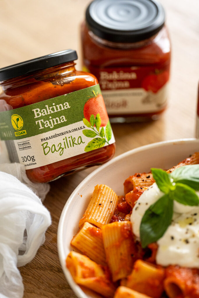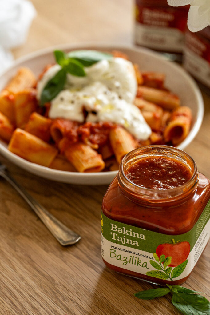 Kuhanim testeninam vmešajte Bakina Tajna paradižnikovo omako, dodajte burrato, poper in olivno olje. To je vse, kosilo je na mizi!