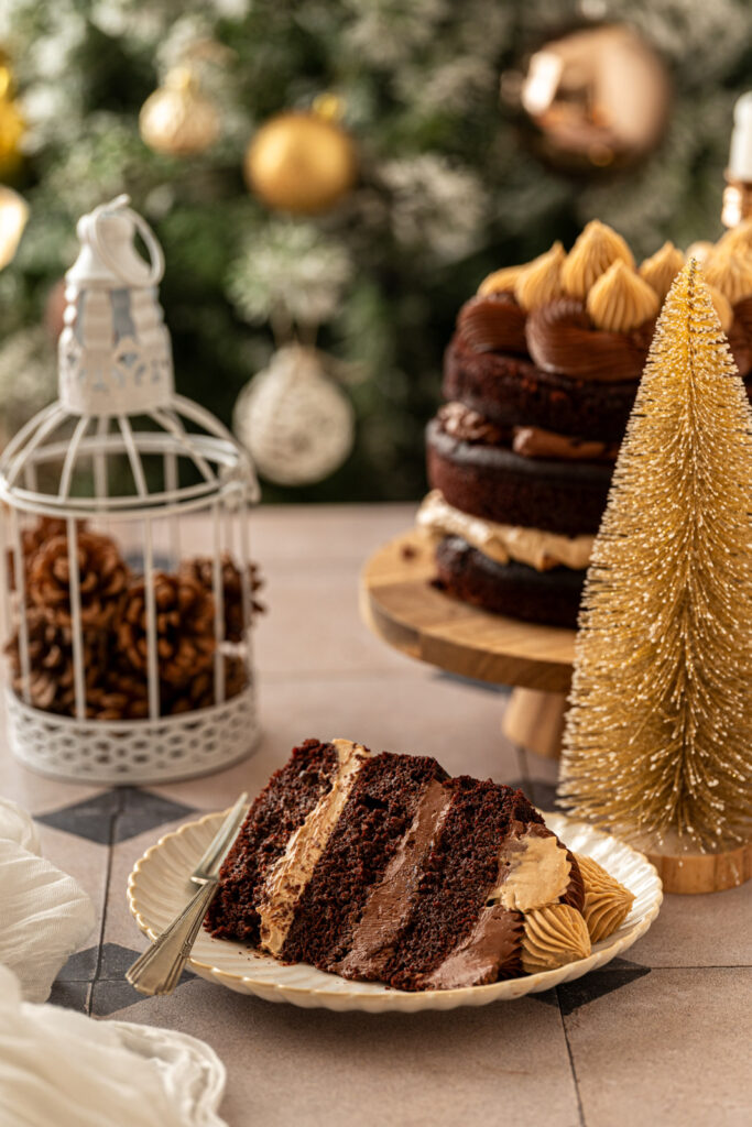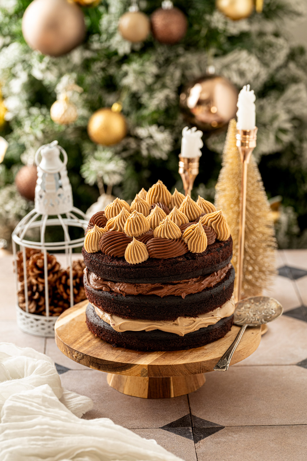Ko je biskvit popolnoma ohlajen sestavite torto. Na krožnik dodajte en biskvit in ga bogato prelijte s kakavovo mešanico. Po vrhu premažite 1/2 čokoladne kreme. Na vrh postavite še en biskvit in ga ponovno prelijte. Po vrhu premažite s 3/4 lešnikove kreme, na vrh pa postavite še zadnji biskvit in ga prelijte. Po vrhu dekorirajte s preostankom kreme.