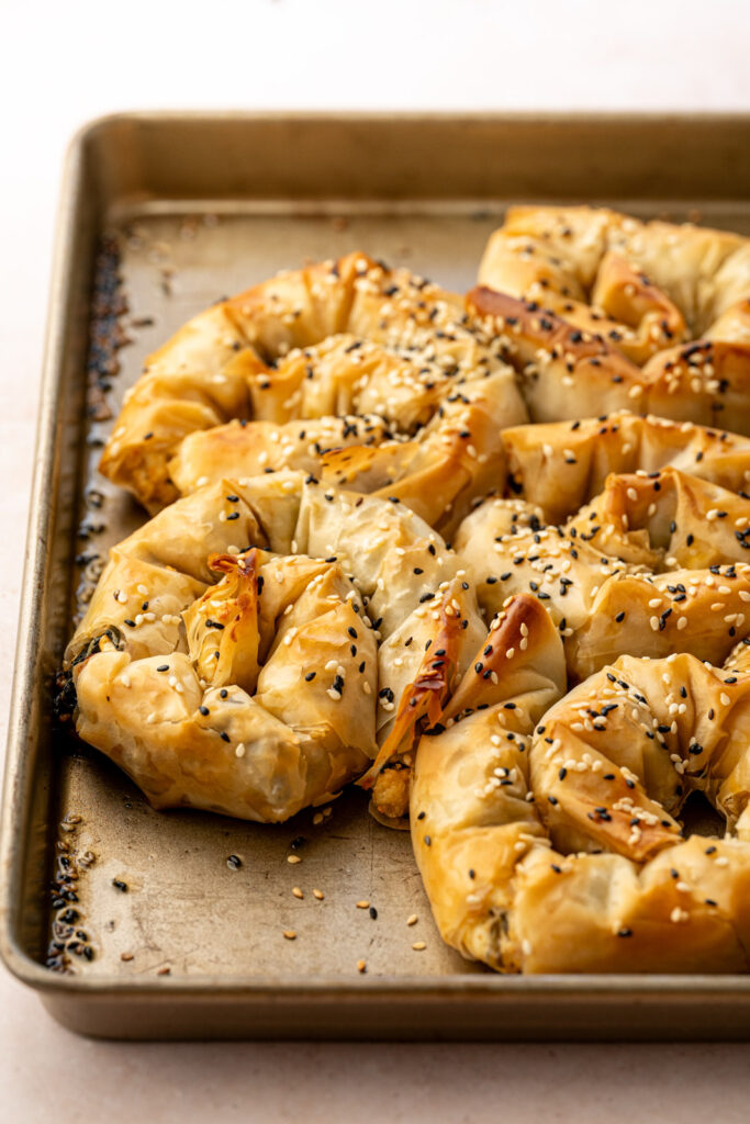 Obožujem kombinacijo sočnih sušenih paradižnikov, slane fete in hrustljavega, zapečenega vlečenega testa. Drugače sem mesojedka, ampak v tej kombinaciji obožujem kar tofu! Vsi okusi se res lepo povežejo, noben okus ne prevlada in nastanejo popolni, hrutljavi bureki, odlični za kosilo ali malico na poti.