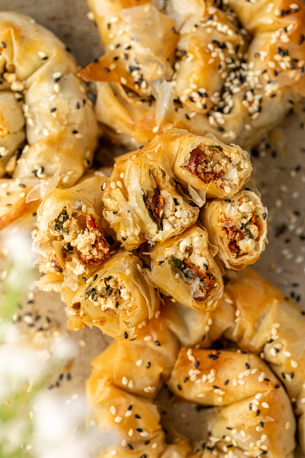 Mini bureki s tofujem, feto, špinačo in sušenimi paradižniki